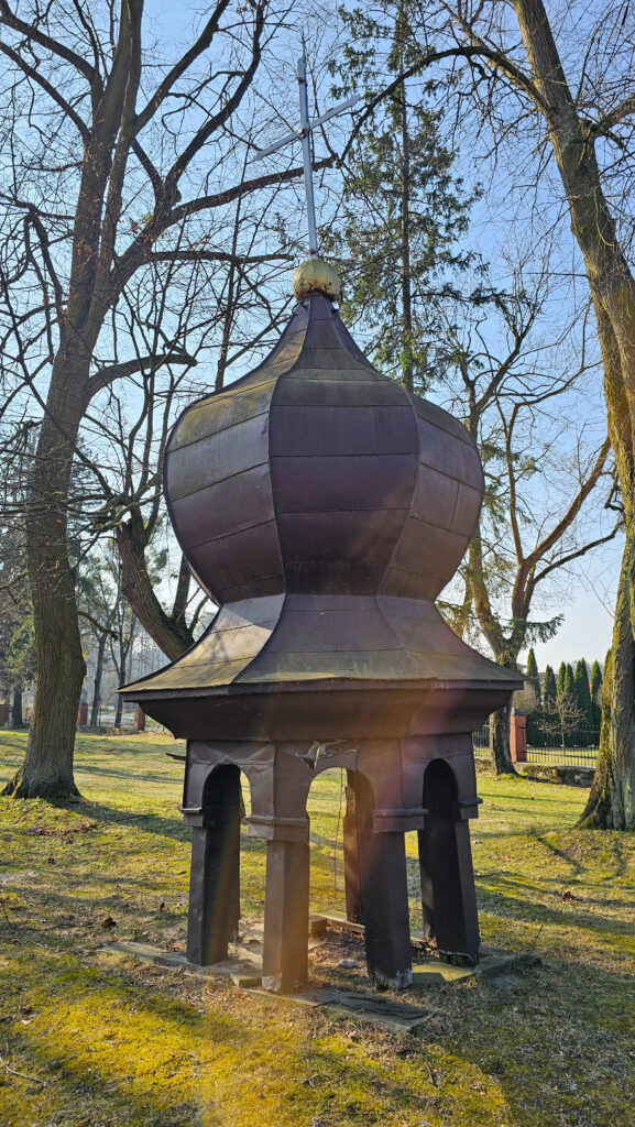 Tuż obok stoi drewniana dzwonnica, której dzwony przez dziesięciolecia ogłaszały ważne chwile mieszkańców.